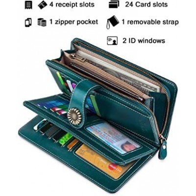 High Capacity RFID Blocked Genuine Leather Womens Wallets with Trifold Wristband Ladies Billfold