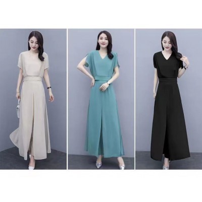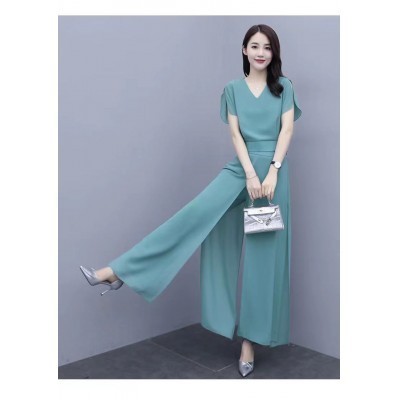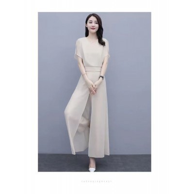 الرئيسية > 2022 New summer solid color chiffon wide leg pants set solid color short sleeve skirt set pants two