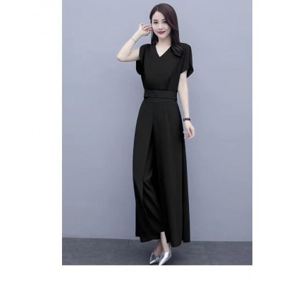 2022 New summer solid color chiffon wide leg pants set solid color short sleeve skirt set pants two