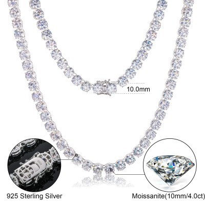قلادة سلسلة تنس مرصعة بحجر مويسانيت لامع 10 مم، مصنوعة من الفضة الإسترليني عيار 925 بنسبة 100%، اجتا