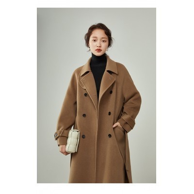 FSLE Womens Winter Korean Temperament Double-breasted 100% Wool Double-faced Woolen Coat Fashion St