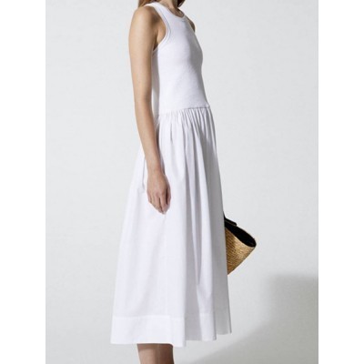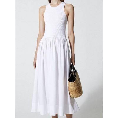 2022 Spring Summer New Round Neck Solid Color Sleeveless Stitching Pleated Women A-line Vest Midi Dr